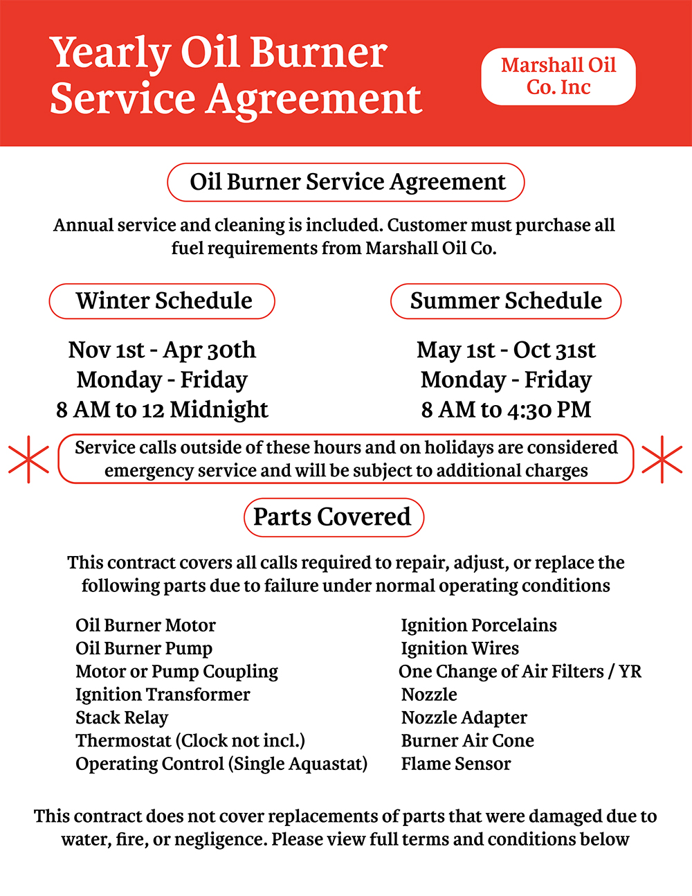 Although our 24/7/365 service is available to all of our oil customers, many of our oil customers elect to carry a service contract. Our service contract includes your annual cleaning, as well as many miscellaneous common parts. Keep your oil burner running smoothly and more efficiently with a yearly clean-up, and peace of mind knowing that many repairs will be covered with your annual contract.